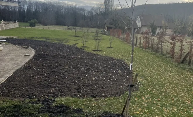 De plus, le client à demandé à ce qu’on retire l’ancienne bordure en béton sur le côté de sa maison à Divonne, qu’on enlève les cailloux présents pour y insérer de la terre végétale et faire une continuité avec la pelouse.