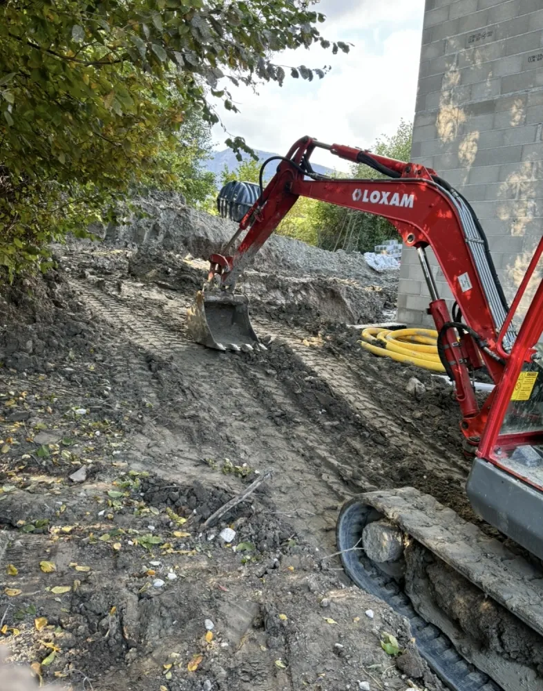 Votre Paysagiste à Chevry à réalisé un terrassement suite à la demande d’un particulier qui souhaitait couper son jardin en deux parties. Le client s’est occupé à ses frais de faire construire la nouvelle maison et votre paysagiste est intervenu pour le terrassement du terrain complet en aménagent une pente qui mène au garage et le jardin qui entoure la maison à l’aide d’une pelleteuse 5Tonnes et un dumper.